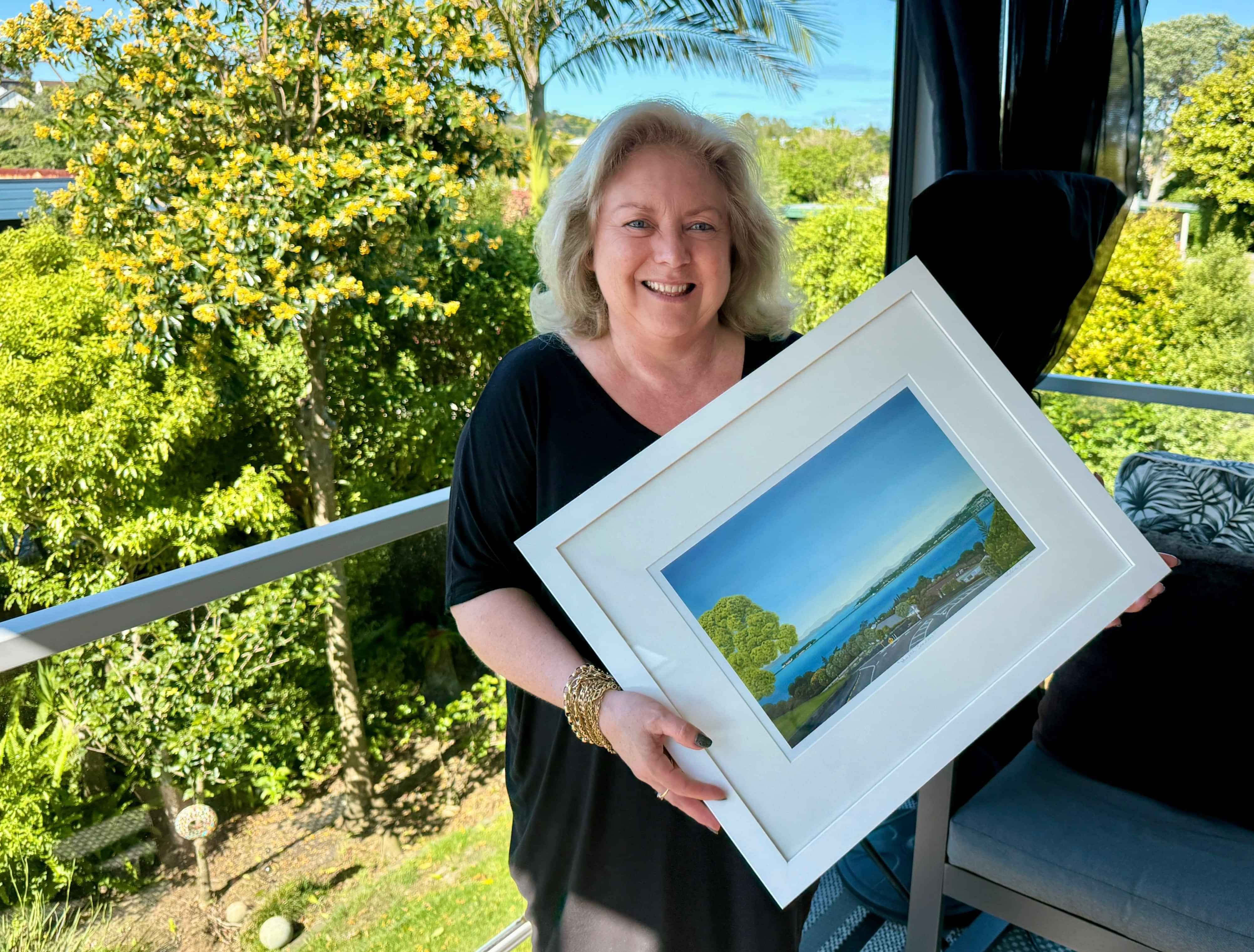 Marion with a beautiful art print, gifted from Heléne.